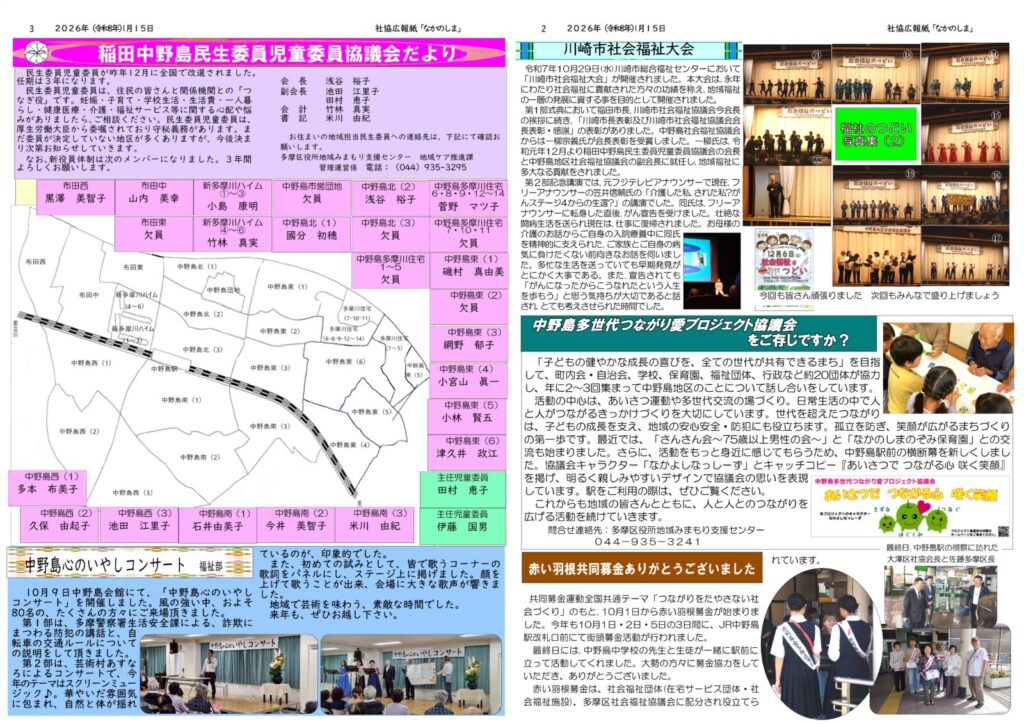 中野島社会福祉のつどいや、福祉部主催の「心のいやしコンサート」、青少年幼児部主催の「おとあそび会」の開催報告を掲載しています。また、民生委員の一斉改選があったことから、新役員体制についても掲載しています。