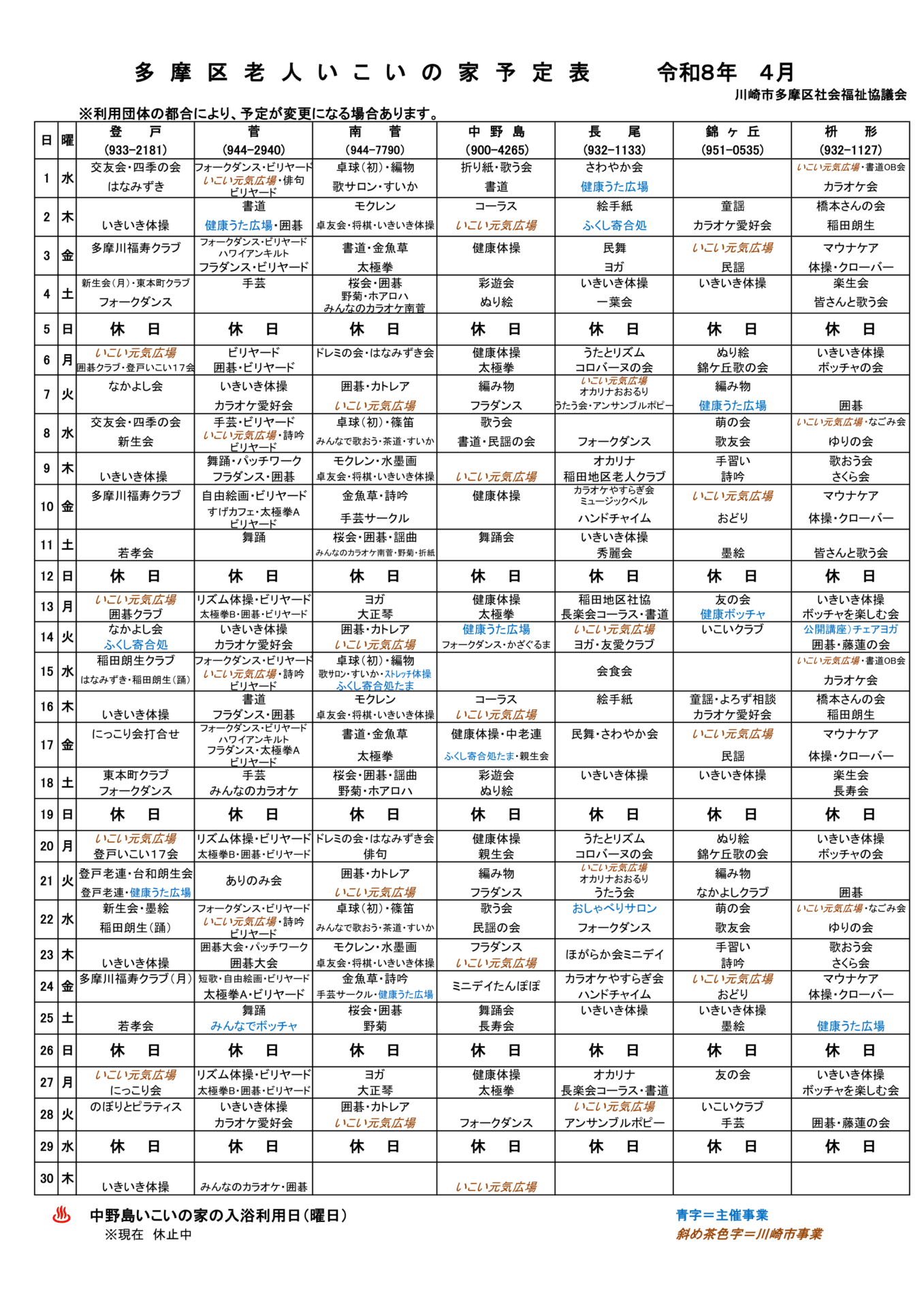 ホーム » 老人いこいの家 » 多摩区老人いこいの家 4月予定表