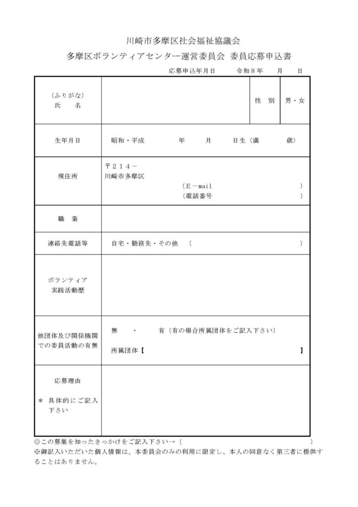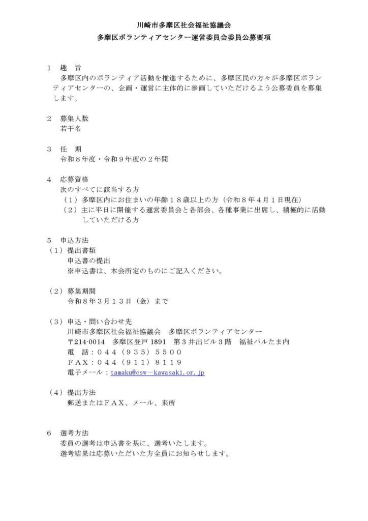 多くの意見を取り入れるために、多摩区ボランティアセンターでは、運営委員の公募をおこなっています。 ご興味のある方は、是非チラシをご覧の上、お申込みください。