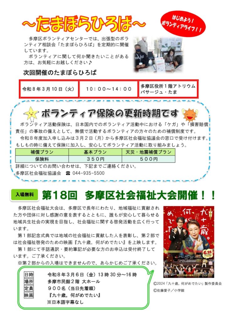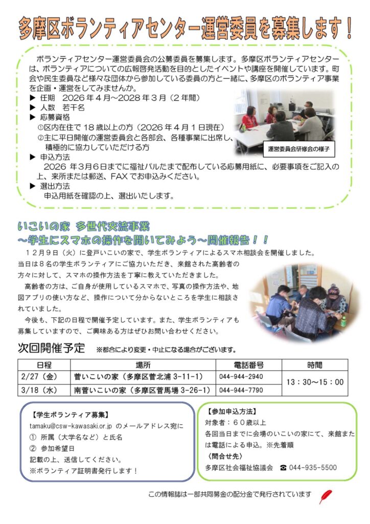 ほか、ボランティアの募集や3月に開催される第18 回多摩区社会福祉大会の告知を掲載しました。