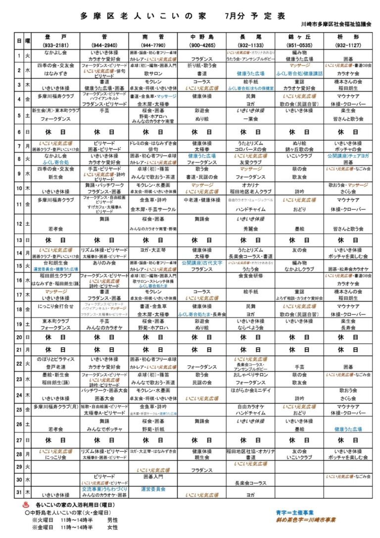 多摩区老人いこいの家 7月予定表