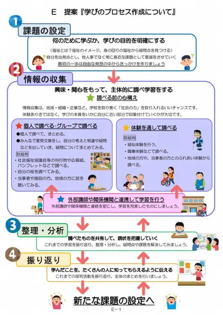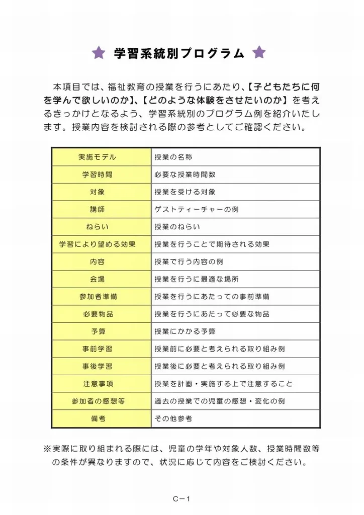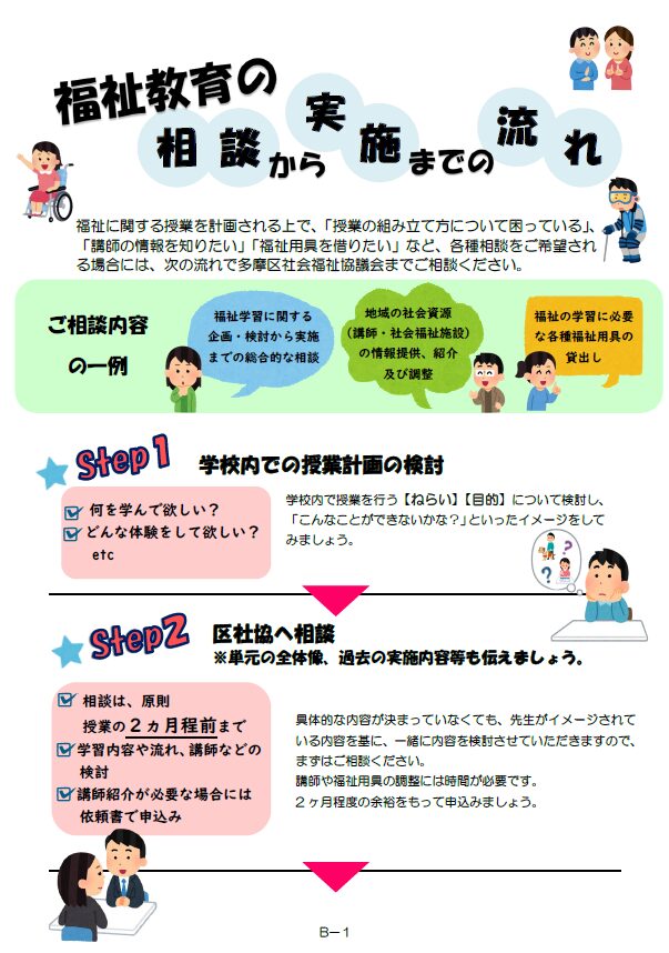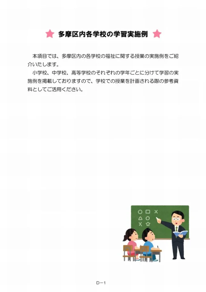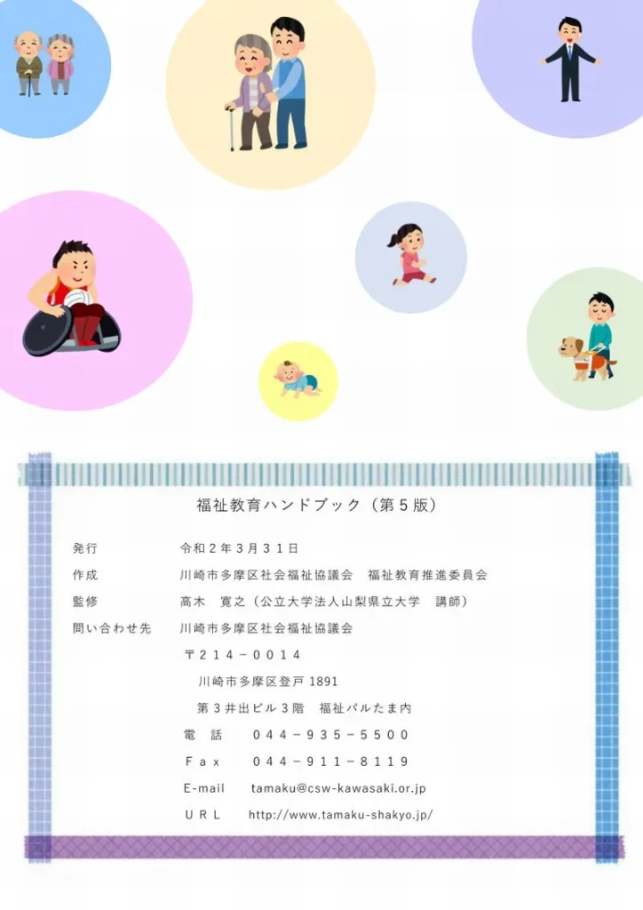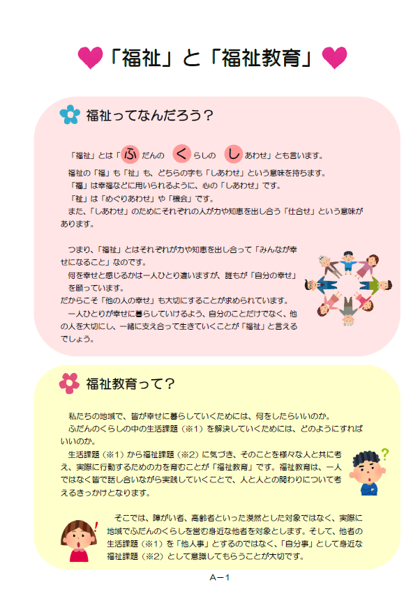 子どもたちを取り巻く環境整備の支え手として、社会福祉協議会が福祉教育を推進し、社会福祉協議会が仲介役となって学校と地域を繋げ、共に福祉教育に取り組むことによって、子どもたちだけでなく、地域を構成する全ての人たちにとっての福祉教育となることを認識とし、かつ、学校等における福祉教育の一助となるよう、福祉教育推進委員会で作成したものです。