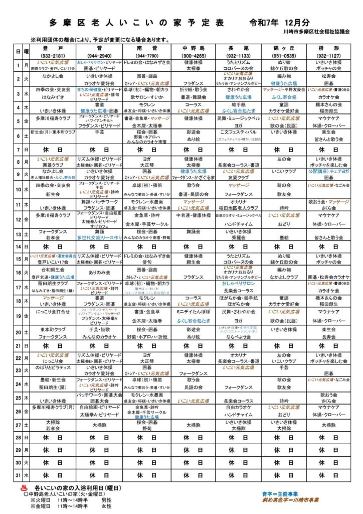 多摩区老人いこいの家 12月予定表